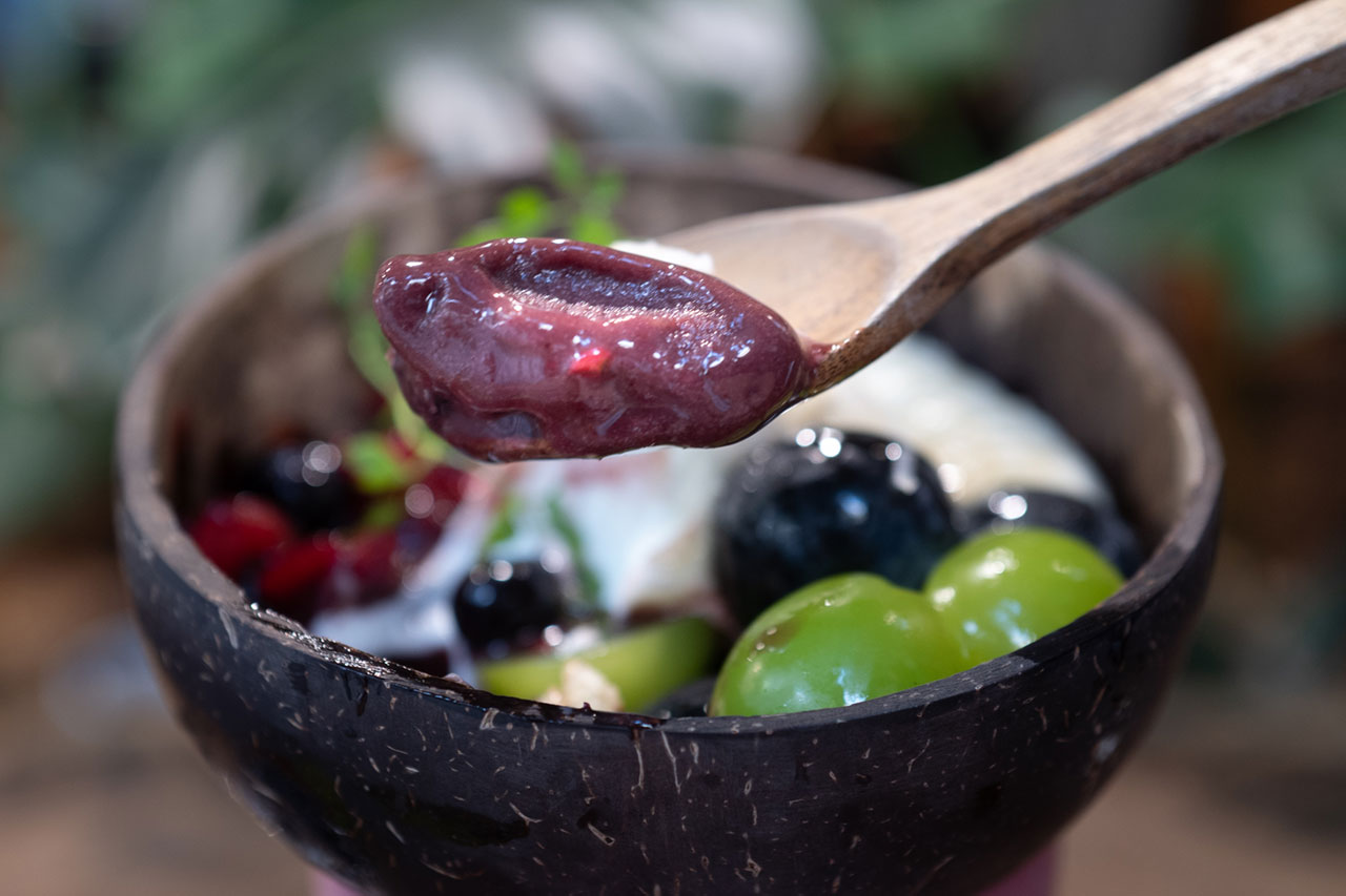ヨーグルトがあることで、アサイーの爽やかな酸味と巨峰の深い甘み、シャインマスカットの清涼感が絶妙に調和。味わいに奥行きを与え、栄養バランスも満たす“ハーフ&ハーフ”設計です。ひと粒ごとに弾ける果汁と上品な香りが全体を包み込み、まるで特別なリトリート気分を味わえる一皿に仕上がりました。