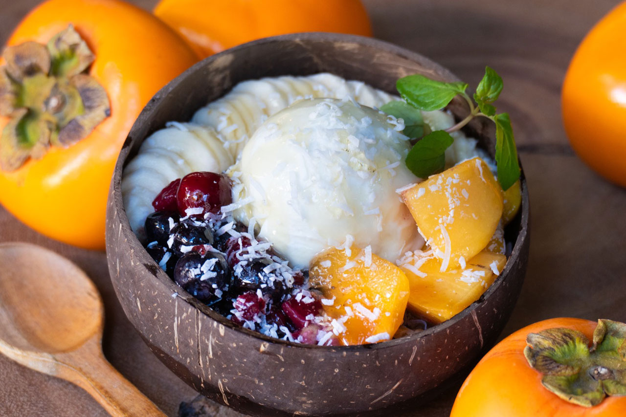 秋の新メニュー「プレミアムアサイーボール ~新潟県産おけさ柿~」と「むらさき芋のバスクチーズケーキ」発売