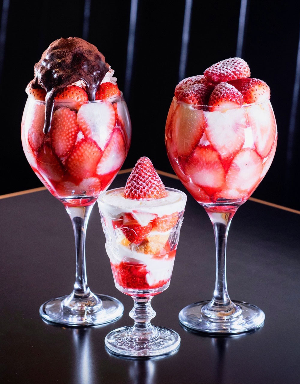 グラス一面に貼ったいちごスライスに始まり、中の具材からトップの飾りまでたっぷりといちごを使ったパフェ。