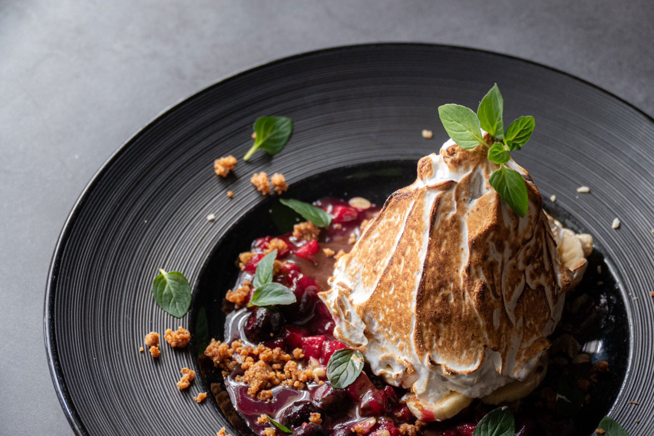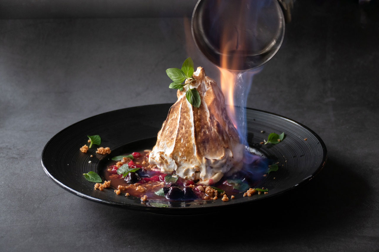 アサイーにメレンゲを重ね、仕上げにフランベで焼き上げる——